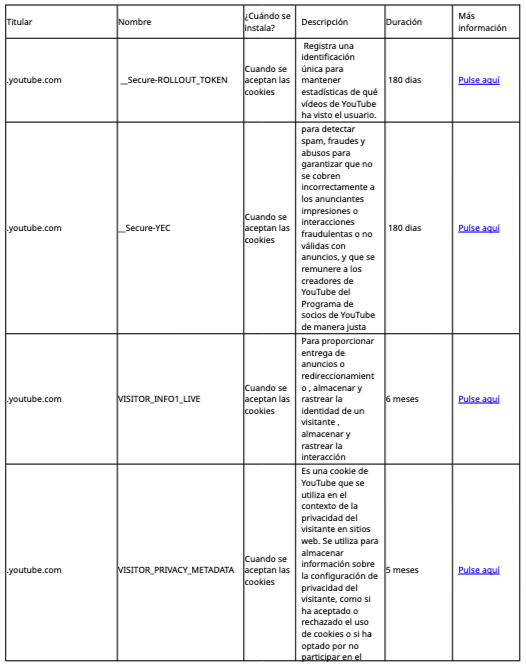 -Cookies de sesión de reproductor multimedia. Permiten reproducir contenido multimedia en las webs que visita el usuario. Por ejemplo, los vídeos que se reproducen automáticamente al entrar en una web están autorizados por este tipo de cookies.